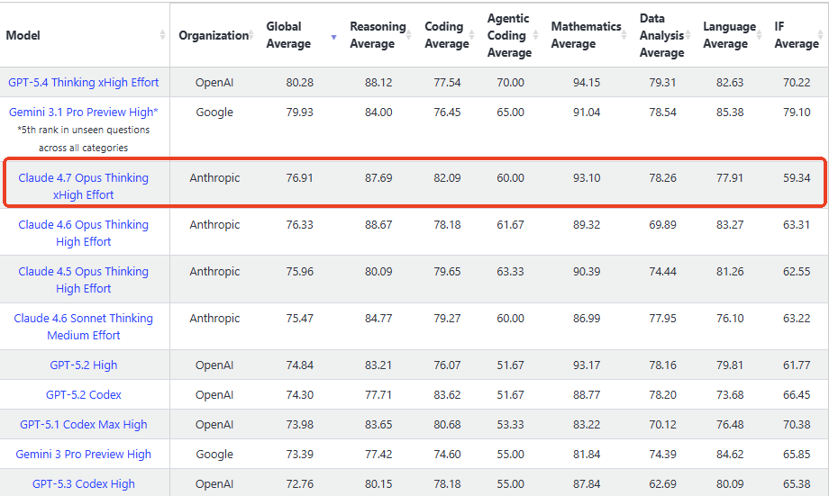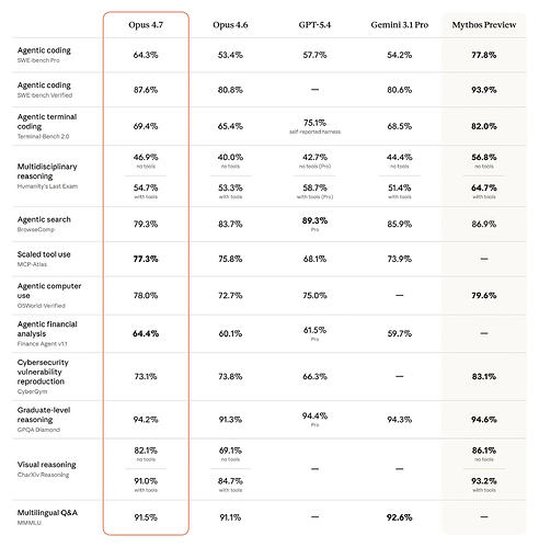 价格:输入$5/输出$25与4.6一样 上下文:1m,与4.6一样 最大输出:128k,与4.6一样 输出速度:50tps左右,比4.6快30% 4.7 vs mythos:性能提升但明显不如mythos 切换回4.6的方法:/model claude-opus-4-6[1m]