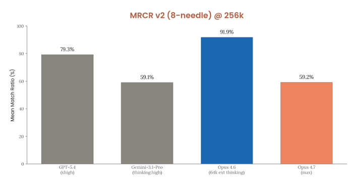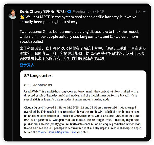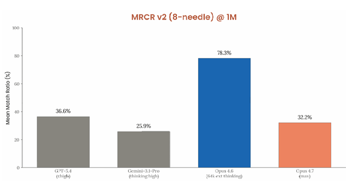 MRCR长上下文测试,1m上下文性能比4.6有了大幅下降